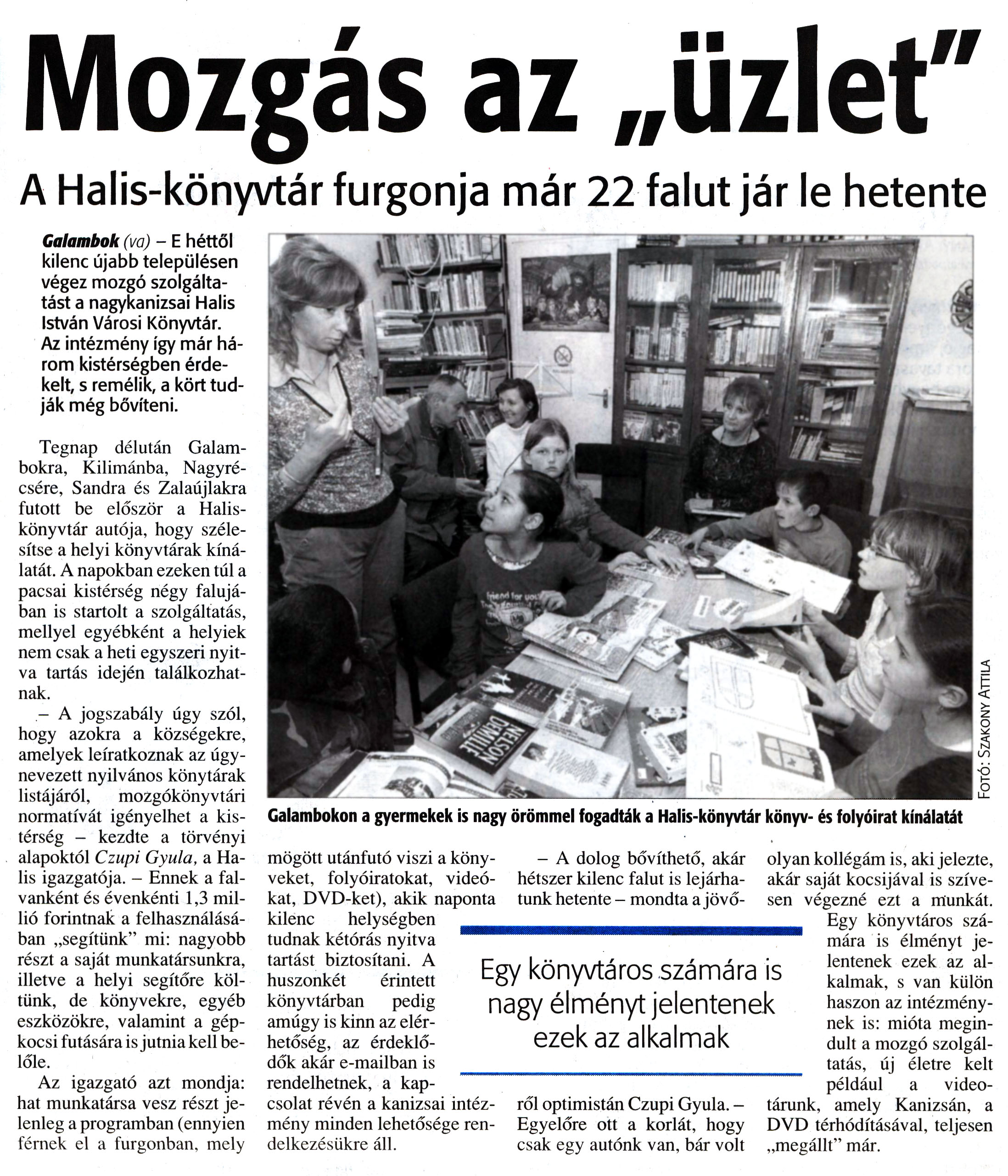 Nyilvános 7544 | 15194 | Zalai Hírlap 2008. március 14. 4. oldal - Mozgás az üzlet | Mozgás az „üzlet" A Halis-könyvtár furgonja már 22 falut jár le hetente Galambok (va) - E héttől kilenc újabb településen végez mozgó szolgáltatást a nagykanizsai Halis István Városi Könyvtár. Az intézmény így már három kistérségben érdekelt, s remélik, a kört tudják még bővíteni. Tegnap délután Galambokra, Kilimánba, Nagyrécsére, Sandra és Zalaújlakra futott be először a Halis-könyvtár autója, hogy szélesítse a helyi könyvtárak kínálatát. A napokban ezeken túl a pacsai kistérség négy falujában is startolt a szolgáltatás, mellyel egyébként a helyiek nem csak a heti egyszeri nyitva tartás idején találkozhatnak. - A jogszabály úgy szól, hogy azokra a községekre, amelyek leiratkoznak az úgynevezett nyilvános könytárak listájáról, mozgókönyvtári normatívát igényelhet a kistérség — kezdte a törvényi alapoktól Czupi Gyula, a Halis igazgatója. - Ennek a falvanként és évenkénti 1,3 millió forintnak a felhasználásában „segítünk" mi: nagyobb részt a saját munkatársunkra, illetve a helyi segítőre költünk, de könyvekre, egyéb eszközökre, valamint a gépkocsi futására is jutnia kell belőle. Az igazgató azt mondja: hat munkatársa vesz részt jelenleg a programban (ennyien férnek el a furgonban, mely mögött utánfutó viszi a könyveket, folyóiratokat, videókat, DVD-ket), akik naponta kilenc helységben tudnak kétórás nyitva tartást biztosítani. A huszonkét érintett könyvtárban pedig amúgy is kinn az elérhetőség, az érdeklődők akár e-mailban is rendelhetnek, a kapcsolat révén a kanizsai intézmény minden lehetősége rendelkezésükre áll. - A dolog bővíthető, akár hétszer kilenc falut is lejárhatunk hetente - mondta a jövőről optimistán Czupi Gyula. - Egyelőre ott a korlát, hogy csak egy autónk van, bár volt olyan kollégám is, aki jelezte, akár saját kocsijával is szívesen végezné ezt a munkát. Egy könyvtáros számára is élményt jelentenek ezek az alkalmak, s van külön haszon az intézménynek is: mióta megindult a mozgó szolgáltatás, új életre kelt például a video-tárunk, amely Kanizsán, a DVD térhódításával, teljesen „megállt" már. |