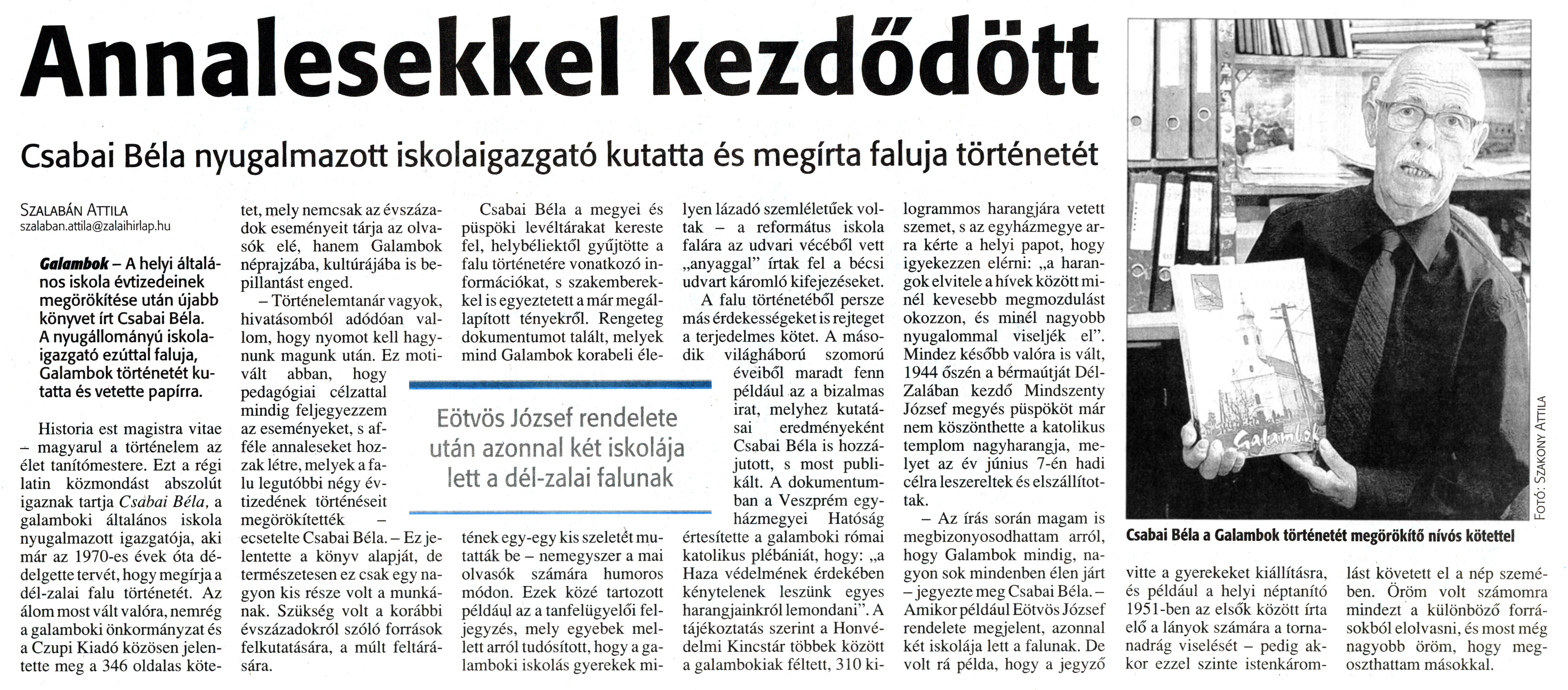 Nyilvános 2135 | 4430 | Zalai Hírlap 2011. június 27. 148. szám 13. oldal - Annalesekkel kezdődött | A cikk szövege: Annalesekkel kezdődött Csabai Béla nyugalmazott iskolaigazgató kutatta és megírta faluja történetét Eötvös József rendelete után azonnal két iskolája lett a dél-zalai falunak Szalabán Attila Galambok - A helyi általános iskola évtizedeinek megörökítése után újabb könyvet írt Csabai Béla. A nyugállományú iskolaigazgató ezúttal faluja, Galambok történetét kutatta és vetette papírra. Historia est magistra vitae - magyarul a történelem az élet tanítómestere. Ezt a régi latin közmondást abszolút igaznak tartja Csabai Béla, a galamboki általános iskola nyugalmazott igazgatója, aki már az 1970-es évek óta dédelgette tervét, hogy megírja a dél-zalai falu történetét. Az álom most vált valóra, nemrég a galamboki önkormányzat és a Czupi Kiadó közösen jelentette meg a 346 oldalas kötetet, mely nemcsak az évszázadok eseményeit tárja az olvasók elé, hanem Galambok néprajzába, kultúrájába is bepillantást enged. - Történelemtanár vagyok, hivatásomból adódóan vallom, hogy nyomot kell hagynunk magunk után. Ez motivált abban, hogy pedagógiai célzattal mindig feljegyezzem az eseményeket, s afféle annaleseket hozzak létre, melyek a falu legutóbbi négy évtizedének történéseit megörökítették ecsetelte Csabai Béla. - Ez jelentette a könyv alapját, de természetesen ez csak egy nagyon kis része volt a munkának. Szükség volt a korábbi évszázadokról szóló források felkutatására, a múlt feltárására. Csabai Béla a megyei és püspöki levéltárakat kereste fel, helybéliektől gyűjtötte a falu történetére vonatkozó információkat, s szakemberekkel is egyeztetett a már megállapított tényekről. Rengeteg dokumentumot talált, melyek mind Galambok korabeli életének egy-egy kis szeletét mutatták be - nemegyszer a mai olvasók számára humoros módon. Ezek közé tartozott például az a tanfelügyelői feljegyzés, mely egyebek mellett arról tudósított, hogy a galamboki iskolás gyerekek milyen lázadó szemléletűek voltak - a református iskola falára az udvari vécéből vett „anyaggal" írtak fel a bécsi udvart káromló kifejezéseket. A falu történetéből persze más érdekességeket is rejteget a terjedelmes kötet. A második világháború szomorú éveiből maradt fenn például az a bizalmas irat, melyhez kutatásai eredményeként Csabai Béla is hozzájutott, s most publikált. A dokumentumban a Veszprém egyházmegyei Hatóság értesítette a galamboki római katolikus plébániát, hogy: „a Haza védelmének érdekében kénytelenek leszünk egyes harangjainkról lemondani". A tájékoztatás szerint a Honvédelmi Kincstár többek között a galambokiak féltett, 310 kilogrammos harangjára vetett szemet, s az egyházmegye arra kérte a helyi papot, hogy igyekezzen elérni: „a harangok elvitele a hívek között minél kevesebb megmozdulást okozzon, és minél nagyobb nyugalommal viseljék el". Mindez később valóra is vált, 1944 őszén a bérmaútját Dél-Zalában kezdő Mindszenty József megyés püspököt már nem köszönthette a katolikus templom nagyharangja, melyet az év június 7-én hadi célra leszereltek és elszállítottak. - Az írás során magam is megbizonyosodhattam arról, hogy Galambok mindig, nagyon sok mindenben élen járt - jegyezte meg Csabai Béla. -Amikor például Eötvös József rendelete megjelent, azonnal két iskolája lett a falunak. De volt rá példa, hogy a jegyző vitte a gyerekeket kiállításra, és például a helyi néptanító 1951-ben az elsők között írta elő a lányok számára a tornanadrág viselését - pedig akkor ezzel szinte istenkárom- lást követett el a nép szemében. Öröm volt számomra mindezt a különböző forrásokból elolvasni, és most még nagyobb öröm, hogy megoszthattam másokkal. Csabai Béla a Galambok történetét megörökítő nívós kötettel Fotó: Szakony Attila |